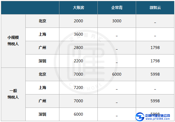 因為基礎服務內容是區分各個代理記賬公司服務差異性最重要的要素,而一般的企業購買該項服務基本上也就能滿足其代理記賬的實際需求,因此我們需要重點關注其收費標準。在此我們以小規模納稅人和一般納稅人這兩種企業類型作為比較對象,以服務時限為1年進行計算,特地選取北京、上海、廣州、深圳這4個國內一線城市來對比代理記賬公司基礎服務的收費情況。